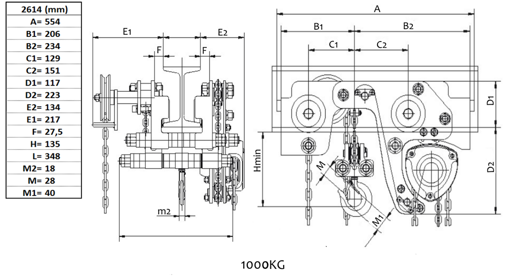 Integrated very low-build chain hoist/trolley 1000 kg