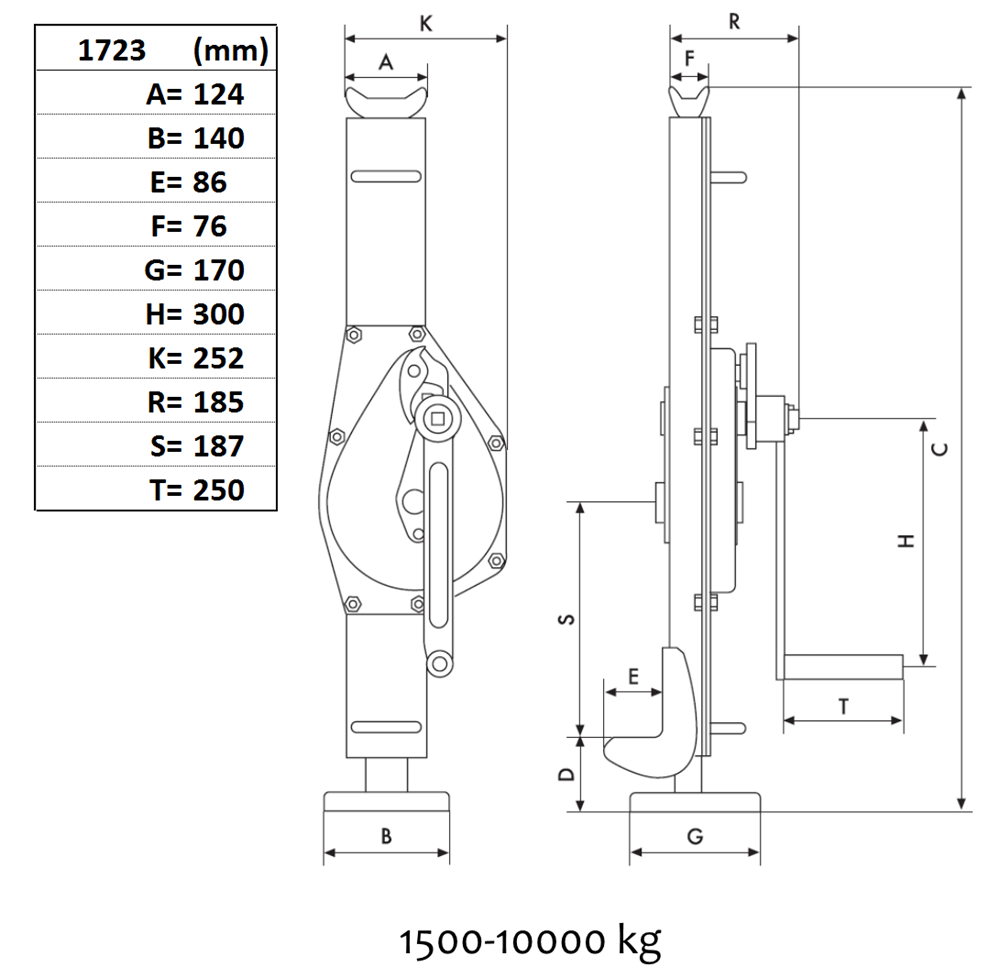 SVERO domkraft 1723. Veven är hopfällbar och lyft kan ske både på topp och klack. Den är dessutom självlåsande och har dubbla spärrhakar för ökad säkerhet.