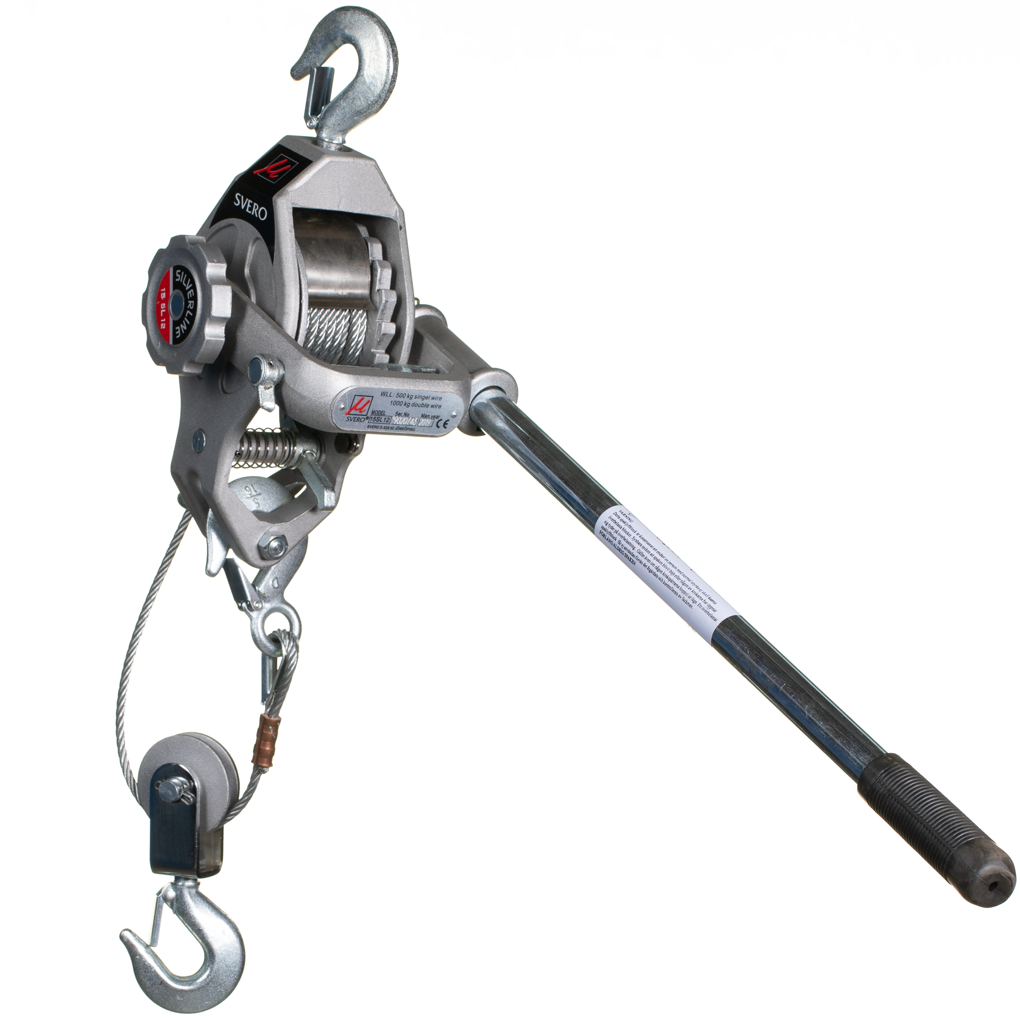 Svero spaklyftblock med vajer för att dra, sträcka och lyfta. Lyfter 500 kg med 1-parts vajer och 1000 kg med 2-parts vajer.